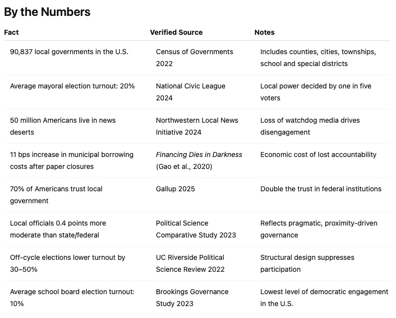 It’s not that people don’t care. It’s that the system makes them easy to forget. Off-cycle elections, buried ballots, and low coverage keep most Americans disengaged. The architecture of local power is designed for silence, and silence has consequences.